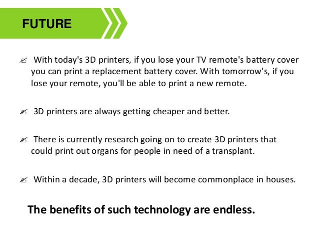 Presentation on 3D printing for students! #3dprinting .... A complete illustrated ppt on 3d printing technology. 2008 2011 a printer that uses an additive process of successive layers of materials to create a 3d object. 3d printers are able to print in plastic, concrete, metal and even animal cells. Presentation of 3d printing the history applications it is an interactive ppt. A presentation on 3d printing technology. Sintering is another 3d printing technology that involves melting and fusing particles together to print each successive layer. But most printers will designed to use only one type of material. 3d printing or additive manufacturing is a process of making three dimensional solid. What is 3d printing ? In recent years, 3d printing has developed significantly and can now perform crucial roles in many applications, with the most important being manufacturing, medicine, architecture. 3d printing or additive manufacturing is a process of making three dimensional solid objects from a digital file. Learn how to 3d print. (for example, you can make your toys at home so toy stores and toy makers might. 3d printing encompasses many forms of technologies and materials as 3d printing is being used in almost all industries you could think of. 17 bionic ears scientists, including an indian.