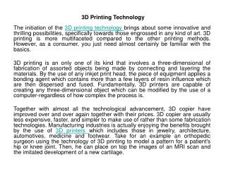 3D Printing Technology Presentation : Each Vary In The Way They Form Plastic And Metal Parts And Can Differ In Material Selection, Surface Finish, Durability, And Manufacturing Speed And Cost.